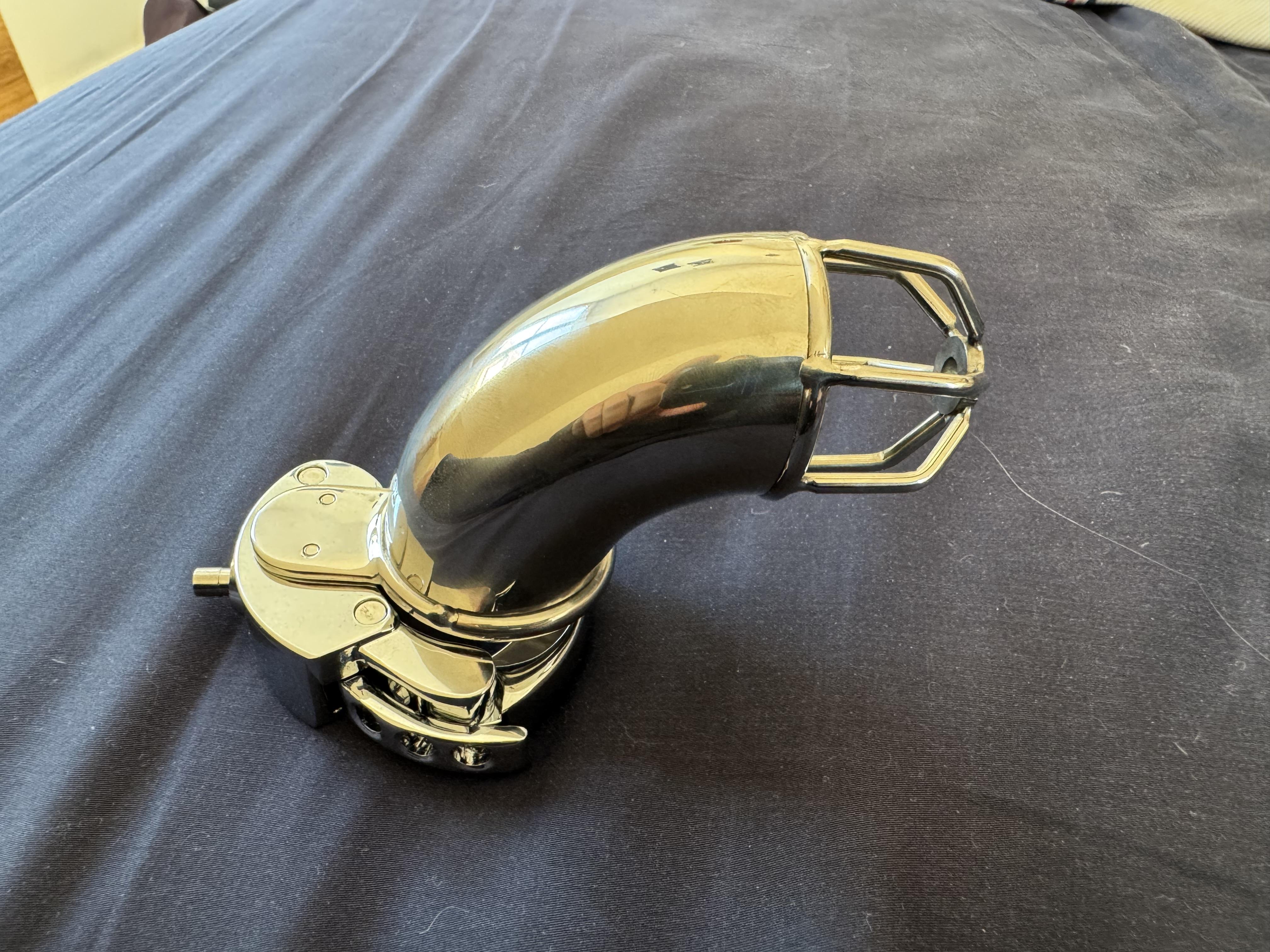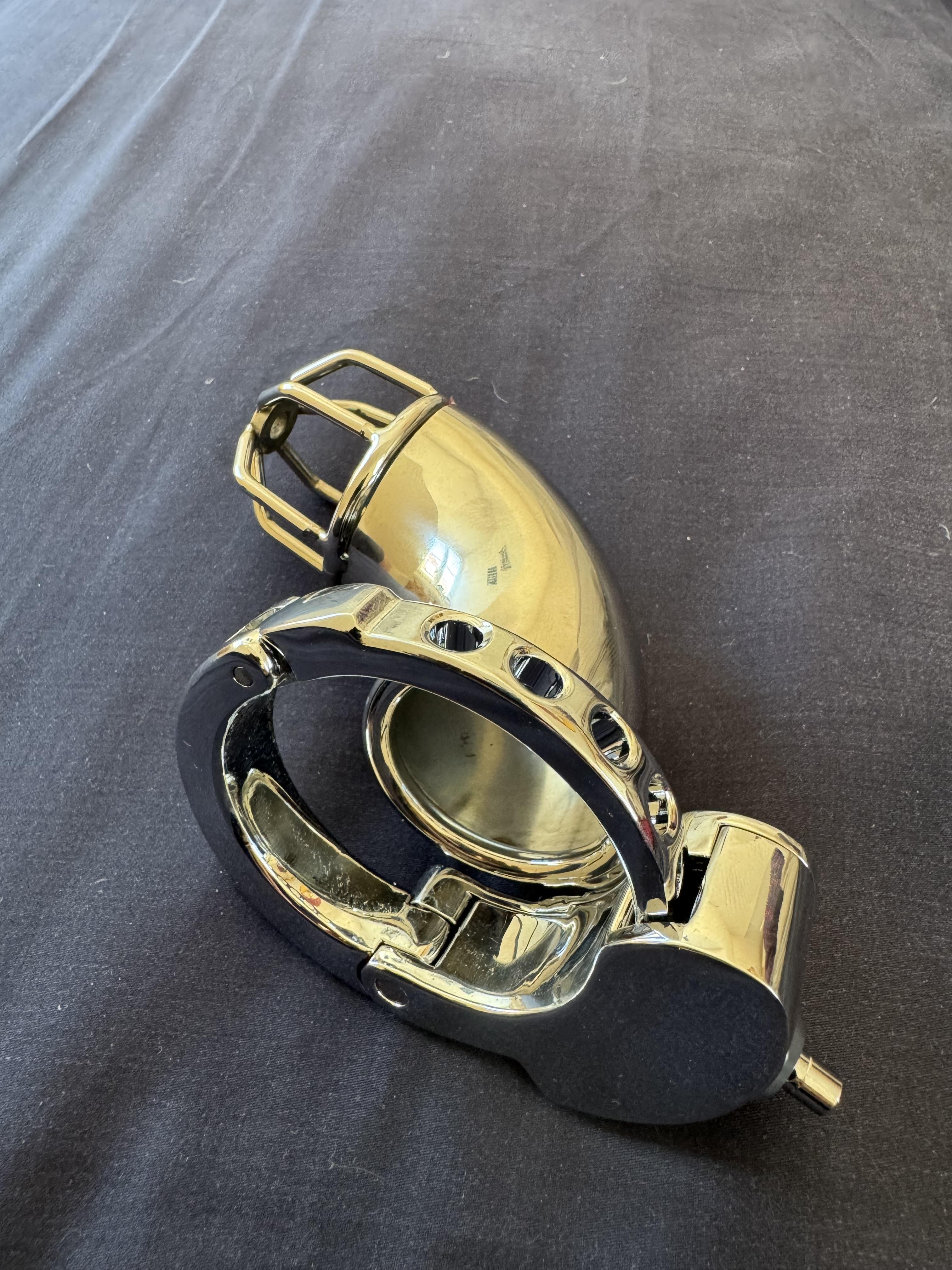 Biete einen neuen unbenutzten Keuschheitskäfig aus Metall mit einstellbarer Passform mit eingebautem Schloss. Er wurde falsch geliefert und eine Rücksendung lohnt sich nicht. Daher möchte ich diesen gern weiter geben. Länge: an der oberen langen Seite etwa 11,5 cm Durchmesser: 3,8 cm Einstellbar von 3,2–5,0 cm Gewicht: 237 g -