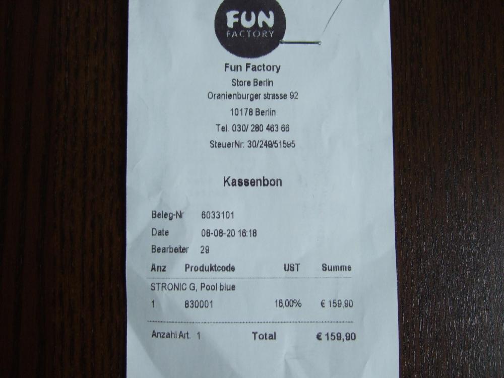 Hallo! Ich biete einen fast neuen Stronic G von Fun Factory in Pool Blue an. Hatte ihn einer Freundin geschenkt, die ihn so gar nicht mag (klingt komisch - ist aber so) und der ich nun ganz schnell was anderes Nettes besorgen möchte. Der Kassenbon liegt bei. Die gesetzliche Gewährleistung beträgt 24 Monate. Das heißt, sollte der Stronic Mucken machen, könnt Ihr ihn bis zum 08.08.2022 bei Fun Factory reklamieren. Der Neupreis beträgt 159 € - ich biete ihn hier für 120 € inkl. versichertem Versand an.